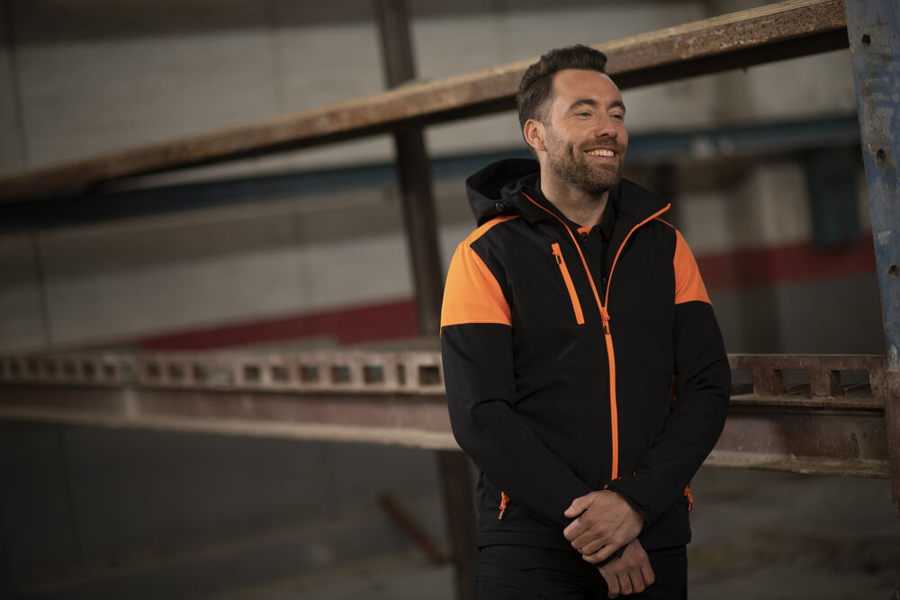 Tvåfärgad softshelljacka med avtagbar huva. Kontrasterande färg i dragkedja och zip-pullers. Kardborrejustering på ärm och elastisk snörning i huva och nederkant. Avrivbar nacketikett och separat storleksetikett. I vänster sidosöm finns tvättchipficka. Zip-pullers i fler färger säljs separat. Testad för industritvätt enigt ISO 15797. Oeko-Tex 100-certifierad och levereras i biobaserad, komposterbar påse.