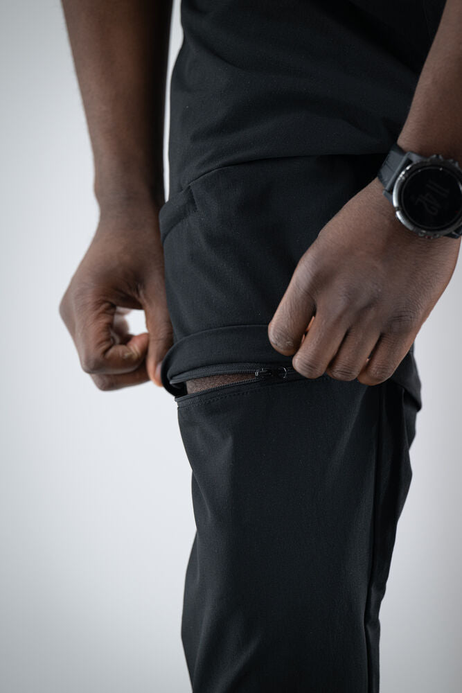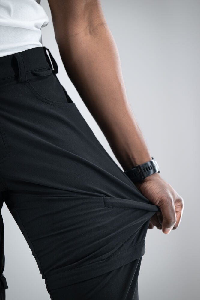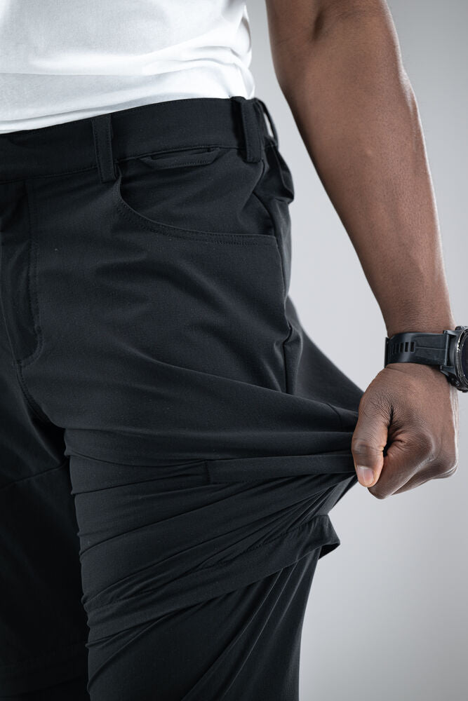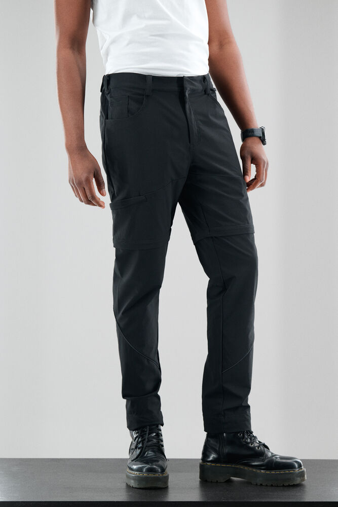 Arbetsbyxor med en sportig, modern look. Kan omvandlas till shorts med avtagbara ben med blixtlås. Byxorna är mycket bekväma tack vare stretchkvaliteten och det elastiska midjebandet. Två framfickor i jeansstil. Vänster framficka har ett separat utrymme för din telefon. Två fickor med dragkedja på låren och en bakficka. Öglor i midjebandet för upphängning. Dubbelt fåll för att förlänga byxorna med 5 cm. På den inre vänstra sidan av sömmen finns en ficka för att sy in en tvättchip. Levereras i en biobaserad, nedbrytbar påse.