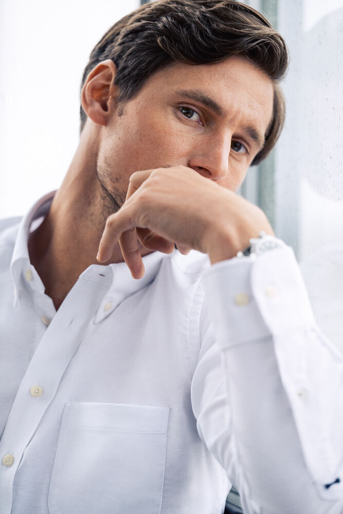 Den har samma utseende som en klassisk Oxfordskjorta, men är ny på många andra sätt. Tyget är en blandning av Long-staple bomull, Lyocell och Elastan. Materialblandningen ger skjortan en otroligt bra funktion och prestanda. Lyxig handkänsla från lyocellen och extrem stretchkomfort från elastan. Skjortan är easy-carebehandlad – tvätta, häng, använd. Denna skjorta är i casualmodell och tre centimeter kortare i kroppslängd än våra mer dressade skjortor. Bröstficka på herrmodellen.