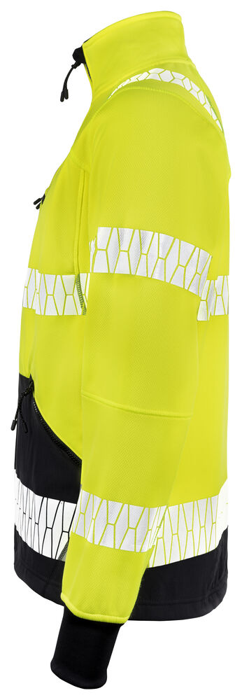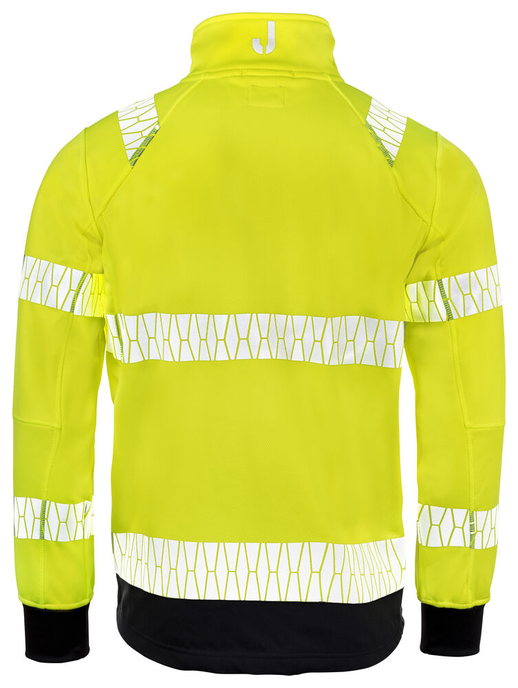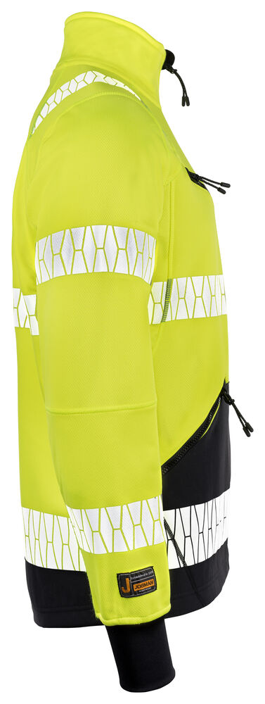 Nya generationens jacka i ett 3-lagers material med en birdseye trikå på utsidan, vind- och vattenavvisande membran och fleece på insidan. Materialet är lätt och följsamt och ger stor rörelsefrihet. Står emot både lättare regn och vind (10000 mm vattenpelare, ej tejpade sömmar) samt har bra andasförmåga. Förstärkningar i svart tyg på utsatta ställen. Svart ribbstickad mudd i ärmslut. Rymliga framfickor med blixtlås. Bröstficka med blixtlås och D-ring för id-kortshållare. Blixtlås framtill med invändig vindslå som skyddar mot drag samt skav mot haka. Zip-puller med reflexdetaljer. Påvärmda reflexer utan sömmar i Jobman design. Reflexer över axlarna för ökad synbarhet.