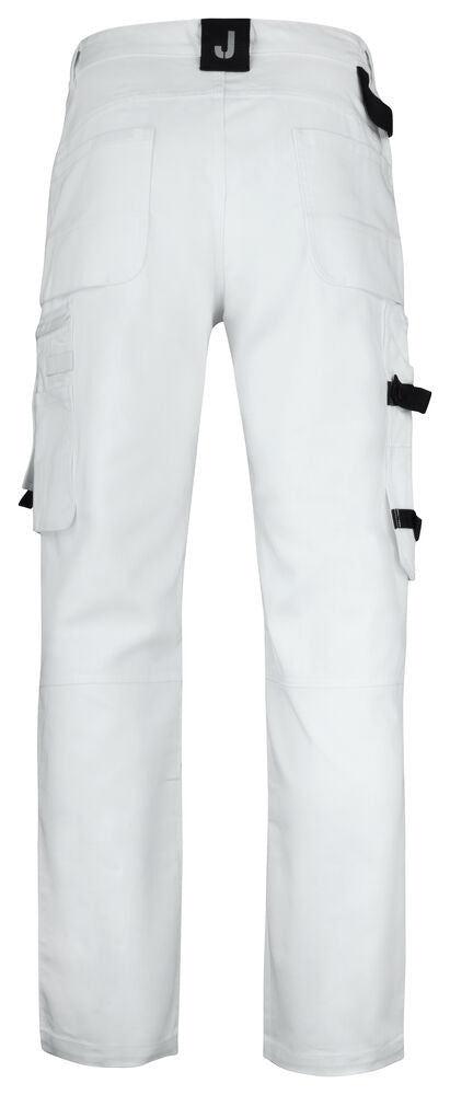 Målarbyxa med utmärkt passform och design utvecklad för yrkesverksamma målare. Jobmans bomullstwill har goda egenskaper, den är slitstark, absorberar färg och minimerar genomblödning. Rymliga fram och bakfickor, benficka med extra fack och blixtlås, mobilficka samt ID-kortsfack. Kniv och tumstocksficka med användbara fack för alla tänkbara måleriverktyg. Byxan har en ögla för trasa. Tål 85 grader tvätt. Knäfickor i slitstarka FA™ polyamid med två positioner för knäskydd.