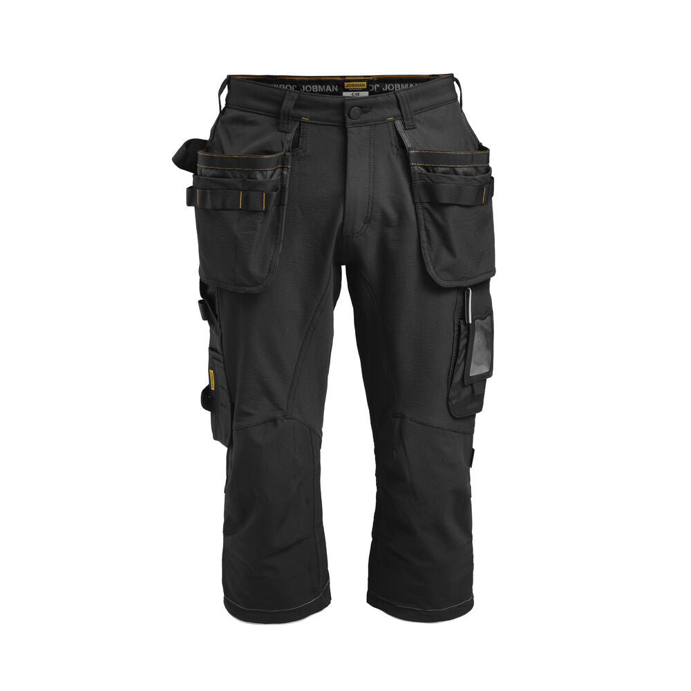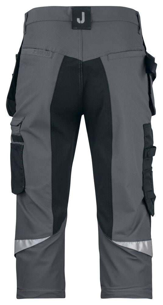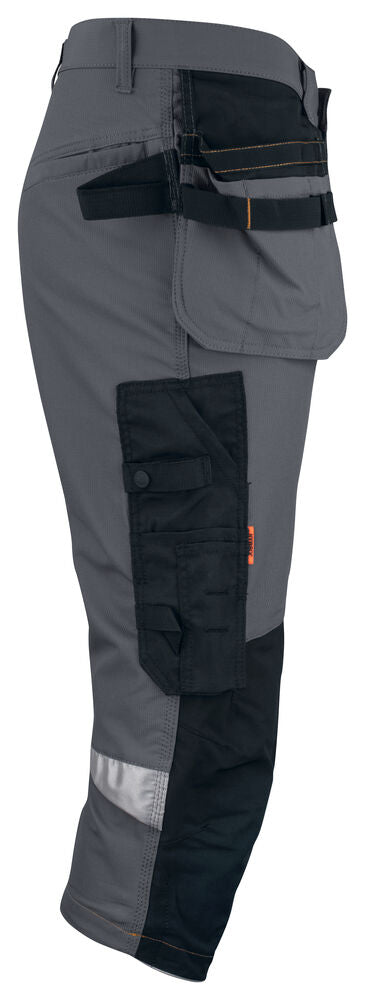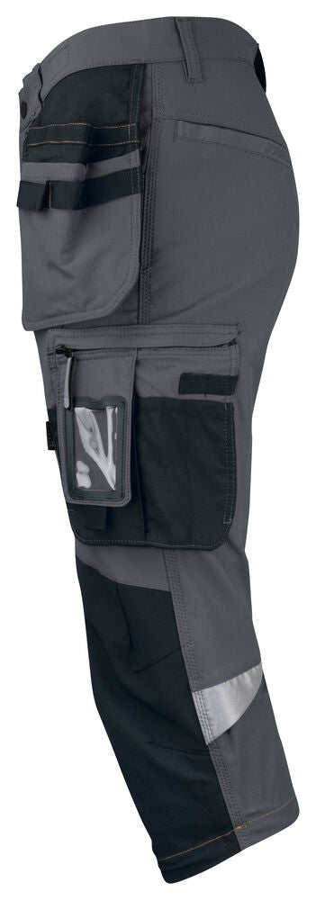 Smidig 4-vägs stretch i slitstarkt Rip-stop material. Grenkil med förstärkt stretch Cordura®. Rymliga hölsterfickor med extrafack och förstärkt insida som kan stoppas ned i framfickorna. Silikonbandet i byxlinningen håller byxan på plats. Extra hällor för bältet på de största storlekarna. Stolpfickor bak. Hammarhank, tumstocksficka med knivhållare. Benficka med täckt blixtlås, ID-kortsfack och telefonficka. Förböjda knän med knäskyddsfickor i slitstark stretch Cordura® med 3M™ reflexpasspoaler och två höjdnivåer. Mesh i knävecken för ventilation. Reflexdetalj för ökad synbarhet i knävecken. Förstärkningar i Cordura® och polyamid.