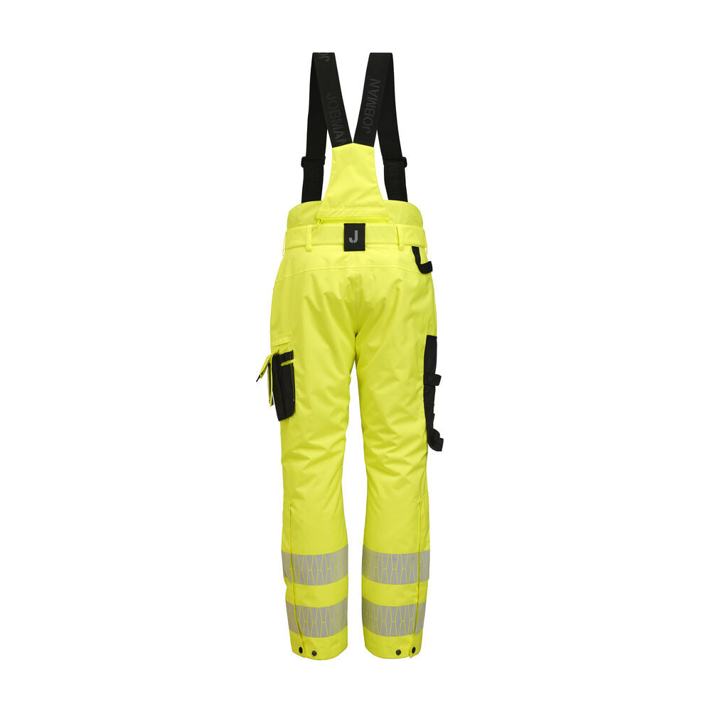 Varmfodrad, vind- och vattentäta byxor i 2-lagers Oxford polyester med tejpade sömmar och med god andasförmåga. Påvärmda Jobman reflexer. Avtagbara hängslen, med blixtlås bak och med kardborrband fram. Även reglerbar med resår i midjan. Extrafodrad inuti över stuss/ sittyta i mjuk microfleece. Rymliga framfickor. Vänster benficka med ID-korts hållare och telefonfack. Tumstocksficka på höger sida. Förböjda ben med knäskyddsfickor. Hammarhank på högersida bak. Dragsko i benslut hindrar kallras, band med tryckknapp för möjlighet att fästa benavslut mot sko. Blixtlås i sidosöm upp till knä förenklar påklädnad. Vattenpelare: 11.000 mm. Andasfunktion: 6.000 g/m² 24h.