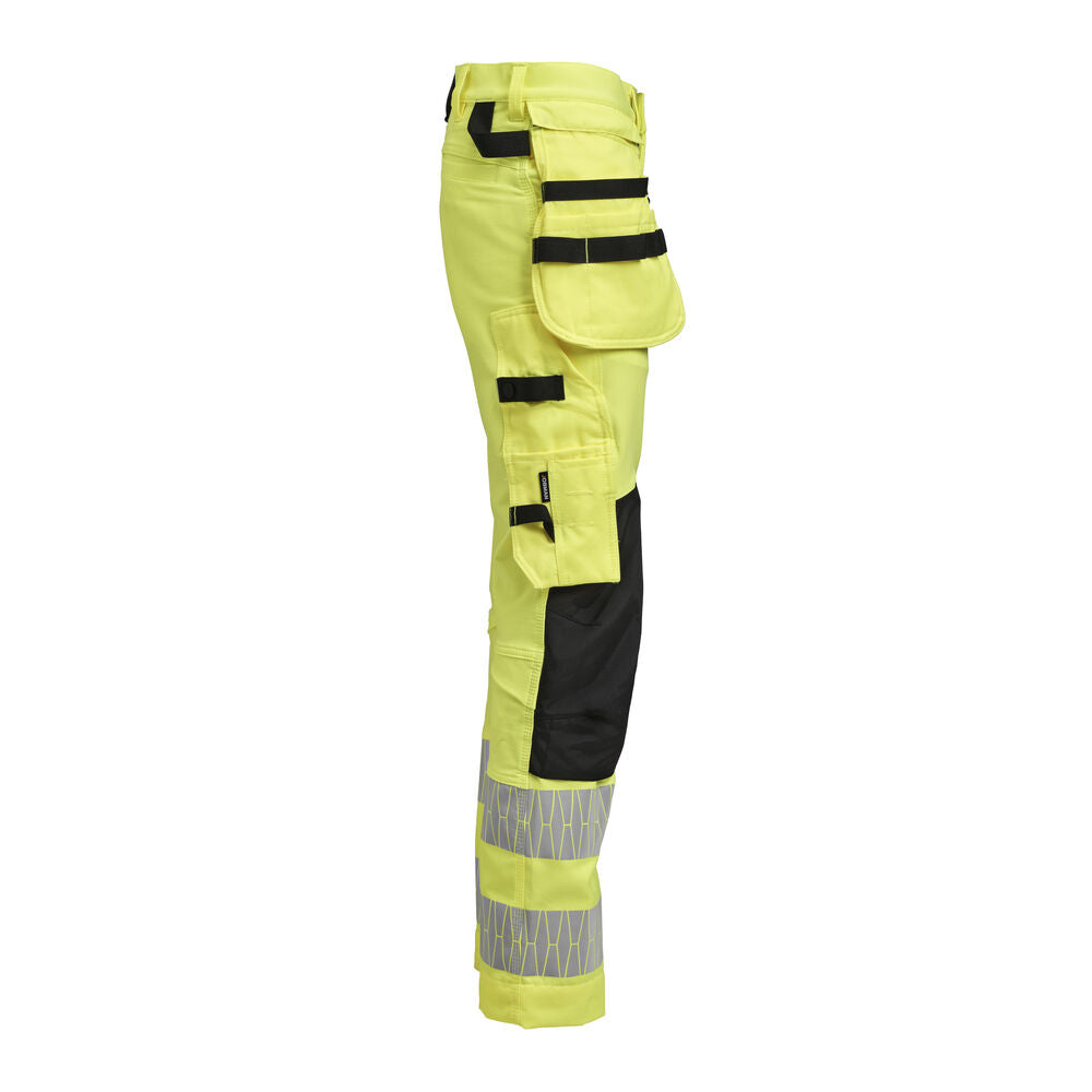 Varselbyxa dam i 4-vägs stretch med partier av slitstarkt vävt tyg vid benslut, benfickor och hölsterfickor. Avtagbara hölsterfickor med zip-in funktion och med extrafack och förstärkt insida, kan stoppas ned i framfickorna. Stretchigt midjeband. Stolpfickor bak. Hammarhank. Tumstocksficka med knivhållare. Benficka med täckt blixtlås, ID-kortsfack och telefonfack. Förböjda knän med knäskyddsfickor i slitstark polyamid med 2 höjdnivåer för knäskydd inuti. Påvärmd reflextransfer, Jobman design. Mesh i knävecken för ventilation. Byxbenet kan förlängas med 5 cm genom ett utvik i benslutet.