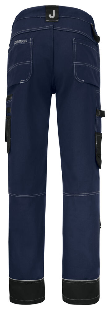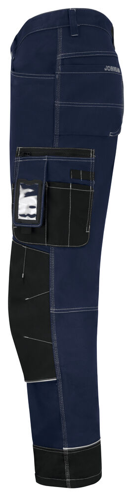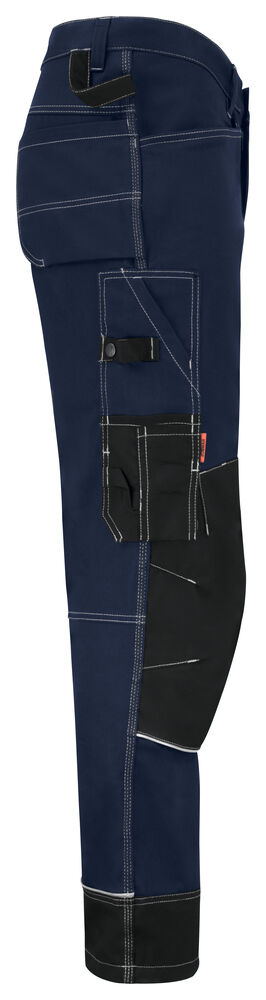 Förstärkta detaljer som bakfickor och tumstocksficka. Rymliga framfickor. Bakfickor med förstärkt insida. Hammarhank. Extra hällor för bältet på de största storlekarna. Tumstocksficka med knivhållare. Benficka med blixtlås, telefonfack, ID-kortshållare och extrafack. Förböjda knän för optimal passform. Knäskyddsfickor i slitstark polyamid med reflexpasspoaler och två höjdnivåer för knäskydden. Förstärkt benslut i polyamid som inte absorberar fukt. Reflexpasspoal och dragsko i benslutet.