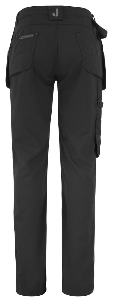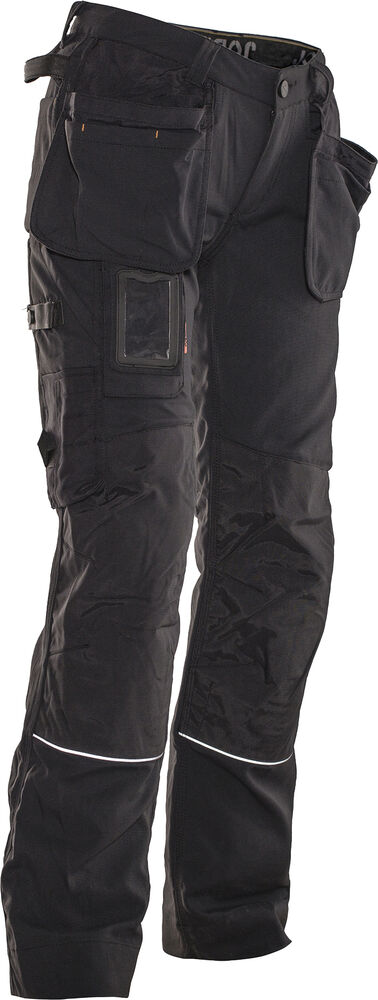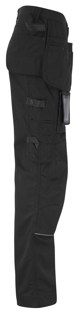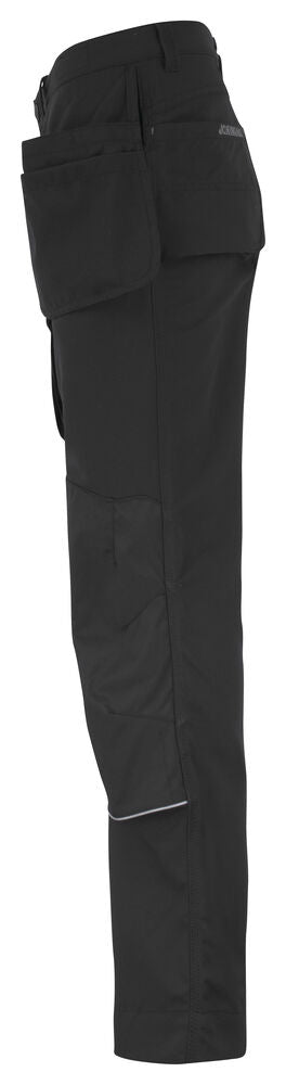 Fast Dry polyamid, mjukt, skönt, lätt och snabbtorkande material med hög slitstyrka. Rymliga hölsterfickor som kan stoppas ned i framfickorna. Gummiknapp som inte repar. Bakfickor med förstärkt insida. Hammarhank. Extra hällor för bältet på de största storlekarna. Tumstocksficka med knivhållare, ID-kortsfack och extrafack. Förböjda knän för optimal passform. Knäskyddsfickor i slitstark polyamid med reflexpasspoaler och två höjdnivåer för knäskydden.