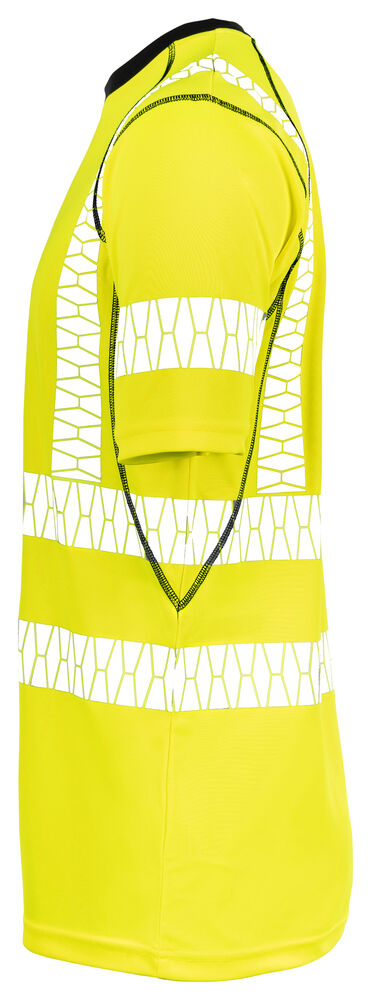 T-shirt i permanent wicking polyester som transporterar bort fukt från huden och håller dig torr. Tyget är speciellt konstruerat för att skydda mot solens ultravioletta strålar, certifierat UPF 40+. T-shirten har bra passform som ger bra rörelsefrihet. Svarta detaljer i halsringningen gör smuts mindre synlig. Flatlocksömmar i svart och printad etikett i nacken. Påvärmda reflexer utan sömmar i Jobman design. Reflexer över axlarna för ökad synbarhet.