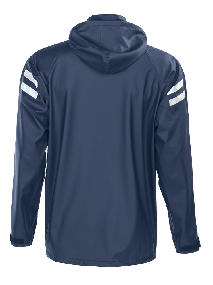Trikåmaterialet är riv- och slitstarkt med lång livslängd och ger bra rörlighet genom sin stretchfunktion. Sydda och svetsade sömmar. Det mjuka materialet behåller också sin rörlighet även när det är kallt. Certifierat enligt EU-normen EN343, vilket innebär att det är godkänt enligt EU:s regler för regnplagg. Avtagbar huva med tryckknappar. Ärmslut med kardborre. Framfickor med lock. Justerbar resårsnodd i nederkant. Reflex på axlar och nacke. Byxan har resårband i midjan och ficköppningar fram med lock, som gör det lätt att komma åt fickor innanför.