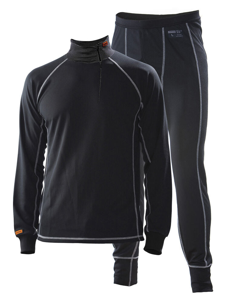 Tröja med förlängd rygg och polokrage med snett blixtlås som inte skaver på halsen. Långkalsong med Y-front. Elastiska sidpartier. Materialet Dry-Tech™ är utmärkt som lager 1 enligt lager-på-lager principen. Det är uppbyggt av mikrofibrer som transporterar bort svett från kroppen och sprider den till en större yta, s k ”Wicking effect”. De mikroskopiska svettpartiklarna dunstar därefter blixtsnabbt. Kroppen förblir torr och man känner sig fräsch hela dagen.