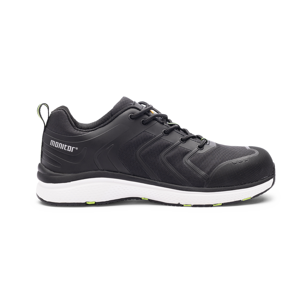 Monitor Courage Safety Shoe är en extremt lätt S3-skyddssko med Ripstop-ovandel, TPU-förstärkningar vid tå och häl, aluminiumtåhätta och Pantzar APT spikskydd. Skon har en EVA-mellansula, gummiyttersu la och återvunnen PU-innersula. Upptäck Monitor Courage Safety Shoe, en del av Monitor Graphic-serien som erbjuder fjäderlätta skydd sskor designade för lager, industri och lättare bygg- och anläggningsarbeten. Med en vikt på endast 450 gram kombinerar denna S3-skyddssko hög säkerhet med exceptionell komfort och lätthet. Ovandelen är tillverkad i Ripstop-material med TPU-förstärkningar vid tå och häl, vilket ger både hållbarhet o ch extra skydd mot slitage. Den breda passformen och klassiska snörningen, tillsammans med en plös m ed bälg för att hindra smuts från att tränga in, säkerställer optimal komfort och skydd under hela a rbetsdagen. Monitor Courage Safety Shoe är utrustad med en bred aluminiumtåhätta och ett Pantzar APT spikskydd, som ger maximalt skydd utan att kompromissa med flexibiliteten. Yttersulan är tillverkad av slitstarkt gummi som ger utmärkt grepp och stabilitet på olika underlag, medan mellansulan i EVA -material erbjuder överlägsen dämpning och komfort. Innersulan är Monitors Pro Support Recycle, till verkad av återvunnen polyuretan, vilket bidrar till både komfort och hållbarhet. Skon är också utrus tad med ESD-skydd för att förhindra elektrostatisk urladdning, vilket skyddar känslig elektronik. Mo nitor Courage Safety Shoe är idealisk för både män och kvinnor som söker en pålitlig och bekväm skyd dssko med överlägsen prestanda och hållbarhet. Välj Monitor Courage Safety Shoe för att uppleva en k ombination av hög säkerhet, enastående komfort och lätthet under hela din arbetsdag.
