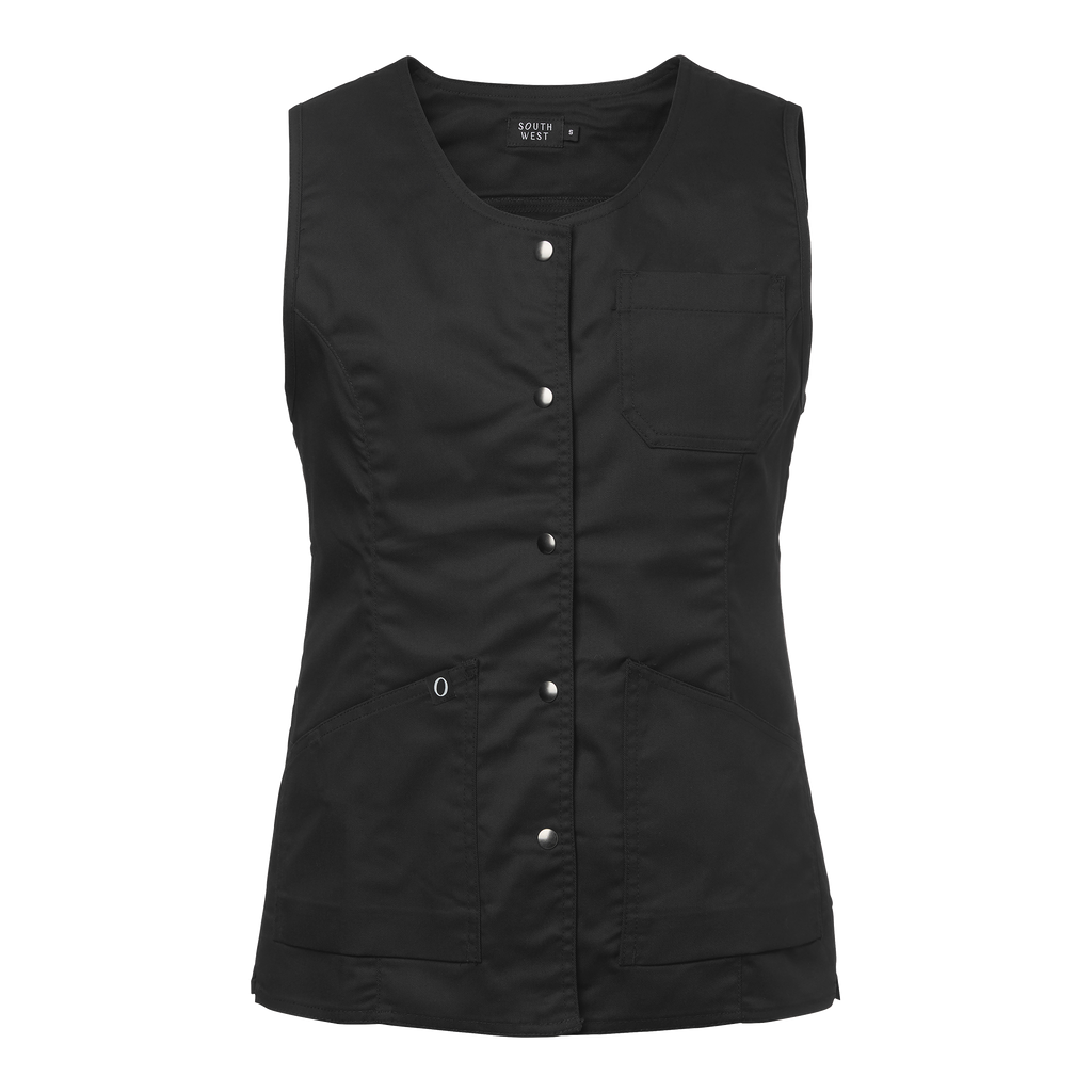 Damväst med insvängd midja, slitsar i nederkant och tryckknappar i framkant. Utrustad med bröstficka och två snedställda fickor fram. Bea Vest från South West är en elegant och funktionell damväst, designad för professionella inom vår d- och serviceyrken som söker ett smickrande och praktiskt plagg. Västen har en insvängd midja som f ramhäver en feminin silhuett, samtidigt som den erbjuder fullständig rörelsefrihet. Designen inklude rar slitsar i nederkanten och tryckknappar i framkanten för enkel hantering. Bea Vest är utrustad me d en bröstficka och två snedställda fickor fram, vilket gör det enkelt att förvara nödvändiga arbets verktyg och personliga tillhörigheter. Med en rygglängd på 68 cm i storlek M är denna väst både bekv äm och stilren, vilket gör den till ett idealiskt val för yrkesverksamma kvinnor som värdesätter båd e funktionalitet och ett professionellt utseende. South Wests höga kvalitetsstandarder säkerställer att Bea Vest håller för daglig användning i krävande arbetsmiljöer och bibehåller sin form och stil över tid.