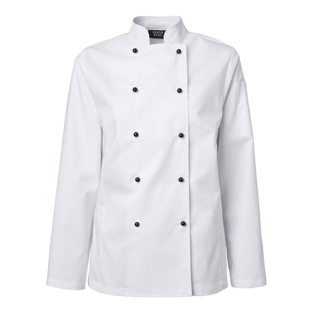 Elsa Chef’s Coat w är en klassisk kockrock i dammodell med dubbelknäppning. Kockrocken har en rymlig passform och långa ärmar med enkelt ärmavslut med sprund som är lätt att vika upp. Rocken har pennf icka på vänster ärm och en hank i nacken. Knappar ingår ej utan kan köpas till separat i 10-pack. Upptäck Elsa Chef’s Coat w från South West. En klassisk kockrock i dammodell med dubbelknäppning. Ko ckrocken har en rymlig passform och långa ärmar med enkelt ärmavslut med sprund som är lätt att vika upp. Rocken har pennficka på vänster ärm och en hank i nacken. Knappar ingår ej utan kan köpas till separat i 10-pack. I storlek 38 är längden mitt bak 70 cm.