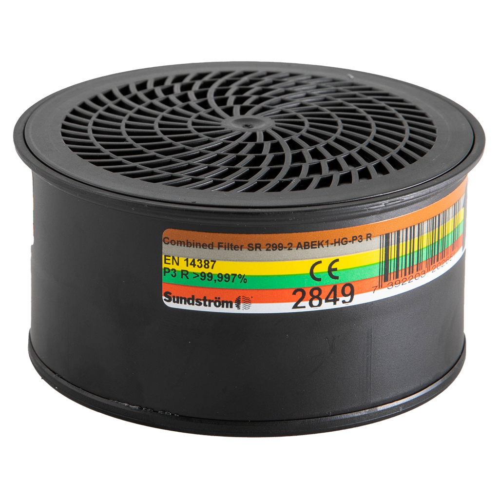 Kombinationsfilter bestående av gasfilter klass 1 och partikelfilter klass 3. SR 299-2 är ett kombinationsfilter bestående av gasfilter klass 1 och partikelfilter klass 3. Filtre t är avsett för användning i Sundströms hel- och halvmasker. Filtret är av typ ABEK1-Hg-P3 R och sky ddar mot följande typer av gaser/ångor och partiklar: Typ A skyddar mot organiska gaser och ångor, t ex lösningsmedel, vars kokpunkt överstiger +65 °C. Typ B skyddar mot oorganiska gaser och ångor, t ex klor, svavelväte och cyanväte. Typ E skyddar mot sura gaser och ångor, t ex svaveldioxid och fluo rväte. Typ K skyddar mot ammoniak och vissa aminer, t ex etylendiamin. Typ Hg skyddar mot kvicksilve rånga. Varning. Maximal användningstid (Hg) 50 timmar. Typ P3 R* skyddar mot alla typer av partikelf ormiga föroreningar. *R (Re-useable): Filtret får användas under fler än ett arbetspass.
