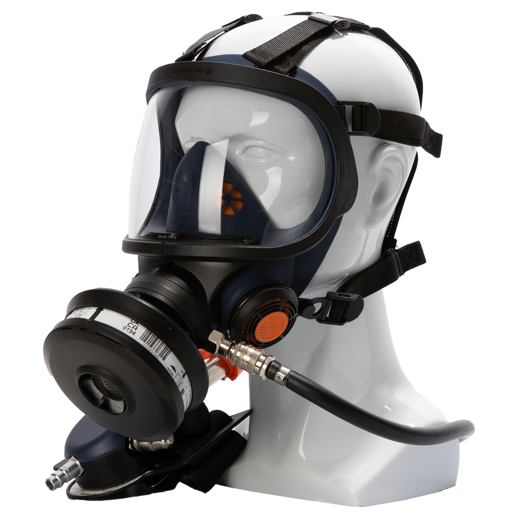 Tryckluftsmatad helmask med utmärkt passform, hög skyddseffekt och mycket god andningskomfort för de tuffaste användningsområden. SR 200 Airline är en tryckluftmask med filter back-up avsedd att anslutas till en lämplig trycklufts källa med andningsduglig luft. Övertrycket som då uppstår i masken förhindrar att omgivande förorena d luft når användaren. Andningsslangen kan också tas bort från masken och den kan därefter användas som ett rent filterskydd. SR 200 Airline kan användas som alternativ till filterskydd i alla situati oner där sådana rekommenderas. Detta gäller i synnerhet vid tunga eller långvariga arbeten och när f öroreningarna har dåliga varningsegenskaper eller är särskilt giftiga. Tillverkad av material som in te ger upphov till gnistor vid friktion, vilket möjliggör användning i explosiv/ brandfarlig miljö. Reglerventilen är försedd med en varningsvissla som ger signal om luftmängden sjunker under den reko mmenderade. Tryckluften bör renas med ett tryckluftfilter typ Sundströms SR 99-1.