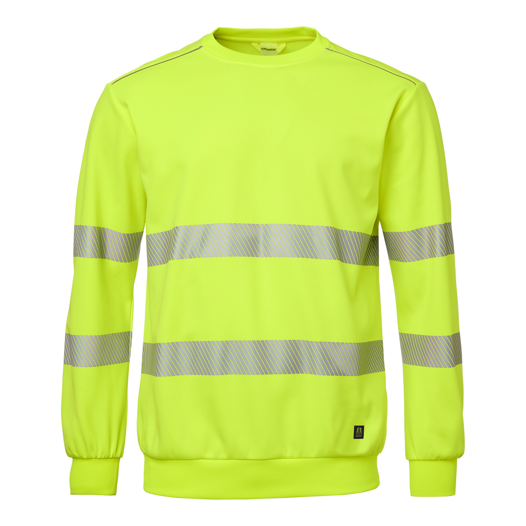 Varsel-sweatshirt med rund hals, segmenterad reflex samt mudd i nederkant och ärmslut. Tillverkad i återvunnen polyester för hållbarhet och komfort. Perfekt för krävande arbetsmiljöer. Upptäck Top Swedes 282 Sweatshirt, en varsel-sweatshirt designad för att erbjuda både komfort och sä kerhet för yrkesverksamma inom bygg och industri. Tillverkad i återvunnen polyester kombinerar 282 S weat hållbarhet med hög komfort för långa och krävande arbetsdagar. Den rundade halsringningen, mudd i nederkant och ärmslut samt segmenterad reflex ger både praktisk funktion och bekväm passform. Den fluorescerande gula färgen tillsammans med reflexdetaljerna säkerställer att du syns tydligt i alla arbetsmiljöer. Oavsett om du arbetar på byggarbetsplatsen, inom industrin eller i andra miljöer där synlighet är avgörande, är Top Swedes 282 Sweatshirt ett pålitligt val. Välj Top Swede för arbetskl äder som kombinerar hållbarhet, komfort och säkerhet — varje dag på jobbet.